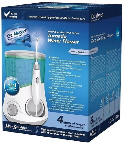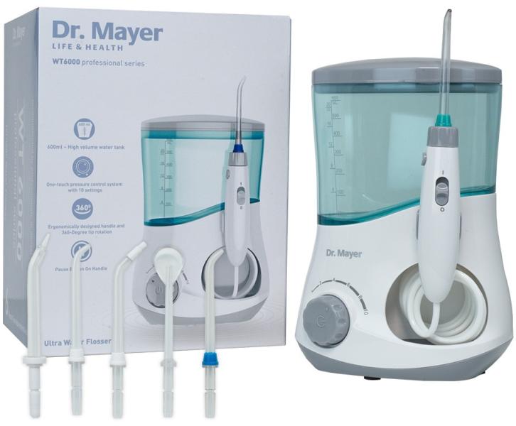 Dr. Mayer WT6000 fix szájzuhany, One Touch és Multi Pulse technológiák, 1400 pulzálás, 10 sebességfokozat, 600 ml tartály, 6 fej mellékelve (3 standard hegy, 1 fogszabályozó hegy, 1 nyelvtisztító, 1 í